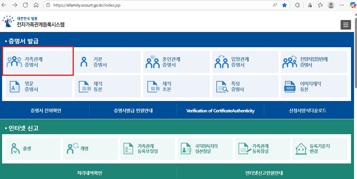 - 상단 메뉴 > [가족관계등록부 발급] 선택